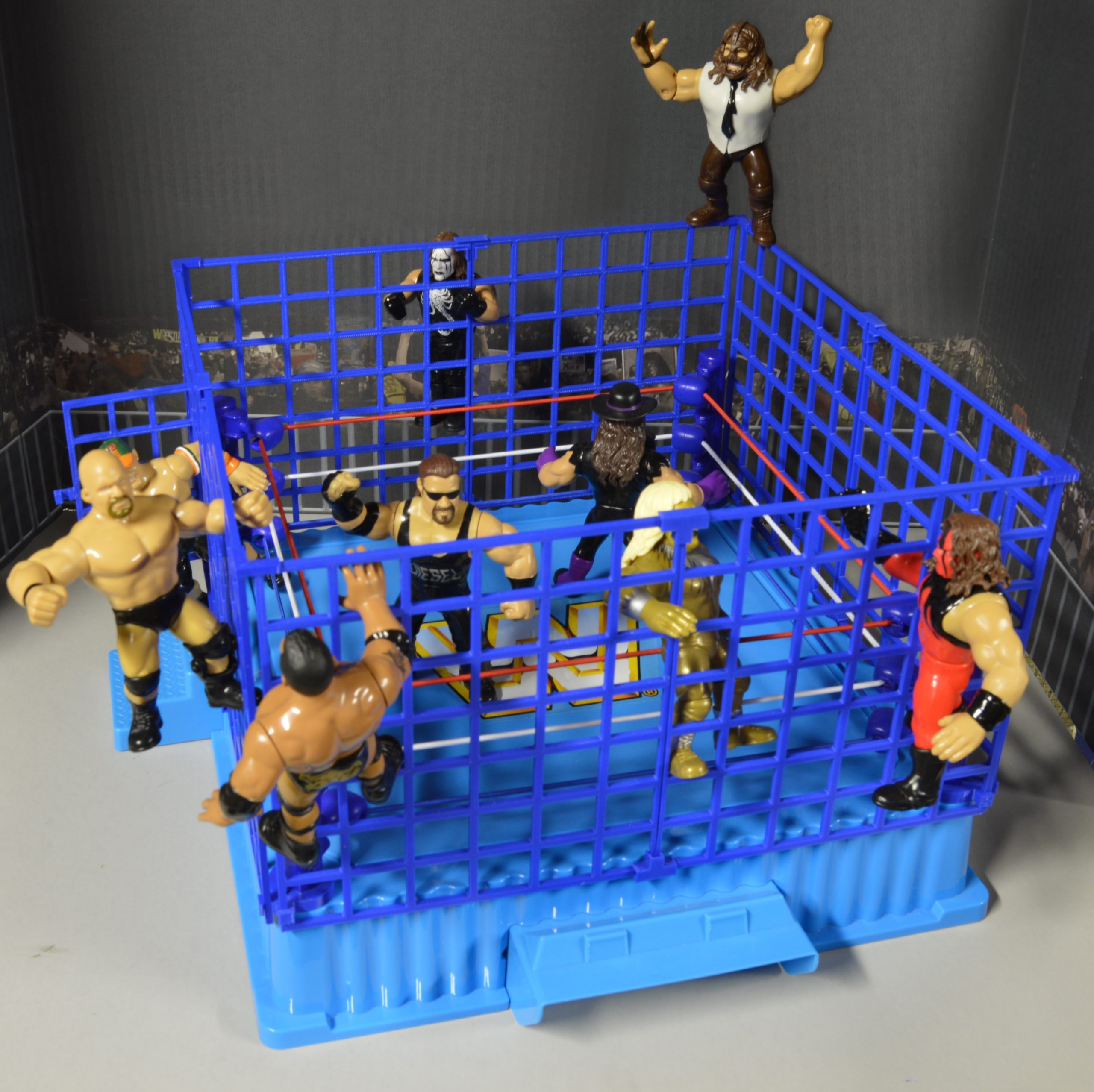 Modeled after the classic blue-barred cage that helped settle WWF grudges in the 1980s and 90s, this cage has been perfectly engineered to fit BOTH the vintage Hasbro WWF ring and the Retro Mattel WWE ring! Created from a durable plastic via 3D-printing technology, the fully-assembled cage is sturdy enough to support multiple figures as they climb the cage walls, leap from the top or utilize the working, latch-able door! It’s a long-desired piece among collectors, and now it can finally be yours!